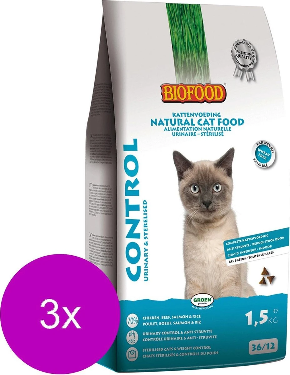 Biofood Cat Control Urinary & Sterilised 1,5 kg Biofood control is hoogwaardige volledige natuurlijke kattenvoeding die ontwikkeld is voor volwassen katten, ter ondersteuning van de urinewegen en bij overgewicht (bijv. sterilisatie). * 70% aan kip, zalm, kippenlever en rijst * Met o.a. prebiotica FOS (inuline), zalmolie met omega 3 en 6 vetzuren en taurine. * Hoge acceptatie en verteerbarheid. * Voor katten met struvietaandoeningen zoals blaasgruis en stenen. * Ondersteunt de urinewegen. Regelt de pH van de urine (in de richting van 6.5) en vermindert de hoeveelheid struvietvormende mineralen. * Ook zeer geschikt voor katten met overgewicht vanwege de lage kilocalorieën. * Zorgt voor een vermindering van haarbalvorming. * Kan volgziekten zoals blaasontsteking voorkomen. * Aangepaste verhouding mineralen. * Tarwevrij. * Beperkt geur en volume van de ontlasting. * Bevat geen kunstmatige toevoegingen. * Bij katten met nieraandoeningen en/of oxalaatproblemen adviseren we SENIOR: hoog kcal (i.v.m. verminderde eetlust), laag fosfor en beperkt eiwit. Samenstelling: gedroogde kip (24%), gedroogd rund (18%), rijst* (15%), erwten, cellulose, gevogeltevet, gerst*, maïs*, gehydrolyseerde kippenlever (7%), zalmmeel (5%), zalmolie (3%), gedroogd wild zwijn (3%), biergist, eipoeder, lijnzaad, lecithine, inuline (1,5% bron van FOS), yucca extract, taurine, cranberries, echinacea.(*ontsloten). Toevoegingen: vitamine A 18.000 IE (E672), vitamine D3 1800 IE (E671), vitamine E (alfa-tocopherol acetaat) 300 IE, vitamine C (ascorbylfosfaat) 100 mg, E1 (ijzer) 75 mg, E2 (jodium) 1,5 mg, E4 (koper) 5 mg, E5 (mangaan) 30 mg, E6 (zink) 65 mg Analytische bestanddelen: ruw eiwit 36%, ruw vet 12%, ruw as 4,3%, ruwe celstof 5,0%, calcium 0,85%, fosfor 0,73%, magnesium 0,09%. Inhoud: 1,5 kg