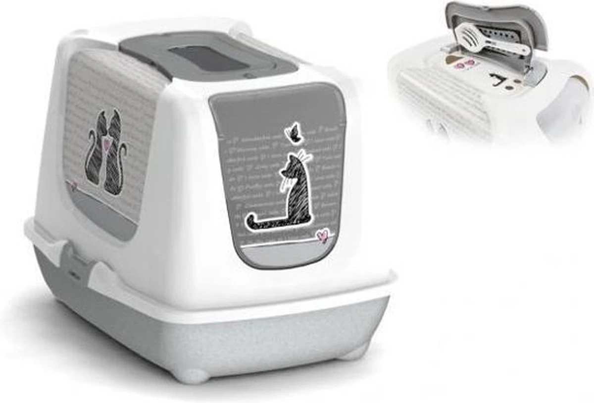 Het klepje kan gemakkelijk opengeduwd worden wanneer je kat er doorheen wilt. Om nare geurtjes tegen te gaan zit er in de bak een koolfilter en ook nog eens een handig schepje verstopt. Deze zitten onder het grijze klepje bovenin de bak. De kap is gemakkelijk vast en los te maken van/aan het onderste gedeelte door middel van klemmen aan de zijkant. De kattenbak is gemakkelijk schoon te maken en te dragen.