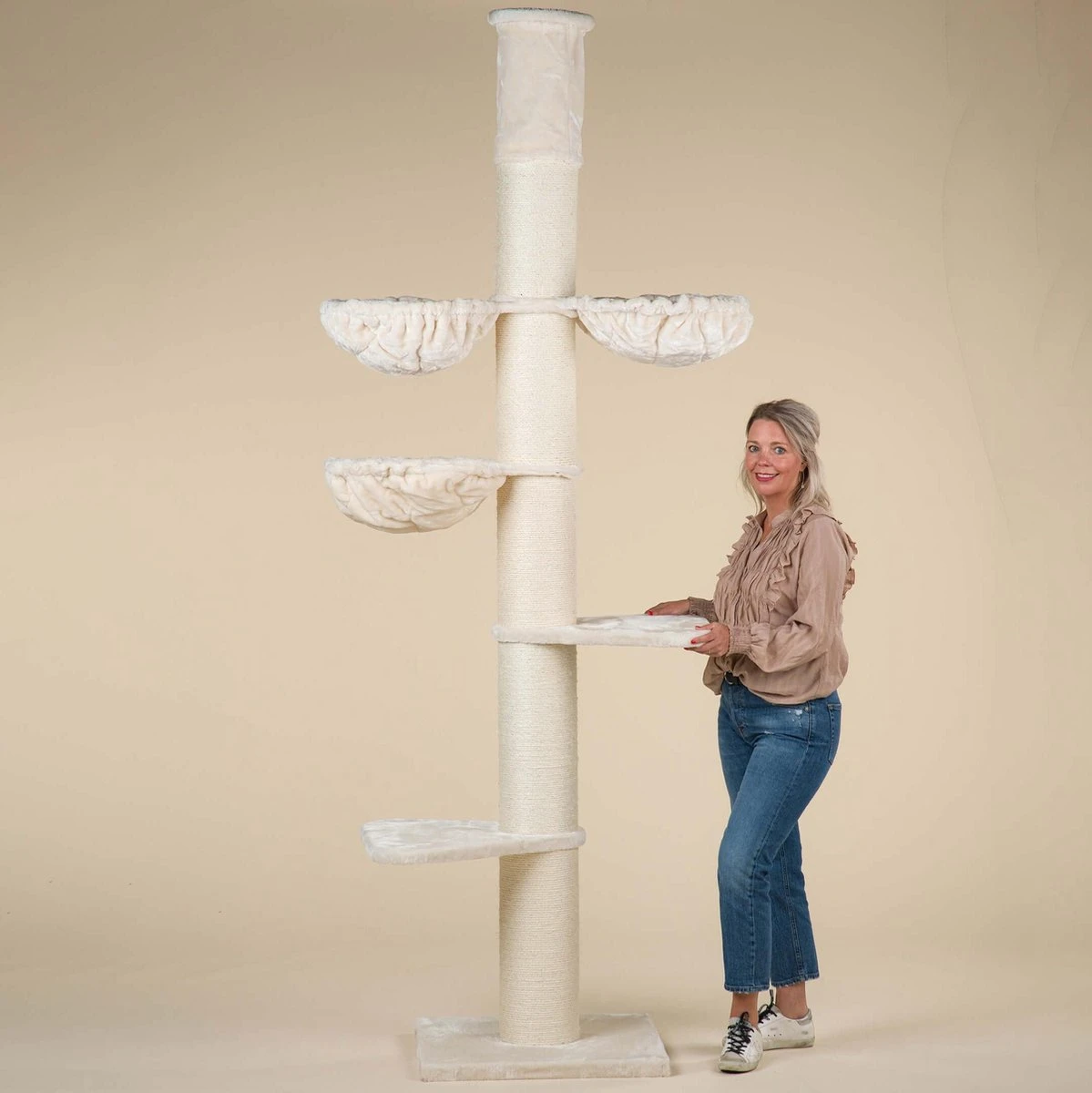 Krabpaal Plafondhoog voor grote katten Maine Coon Tower Plus Crème Beige is met ca 36KG een zeer stevige RHRQuality krabpaal met extra dikke 20cm diameter sisalpalen. Alles wat een kat zich kan wensen. Deze krabpaal is 235-255cm verstelbaar