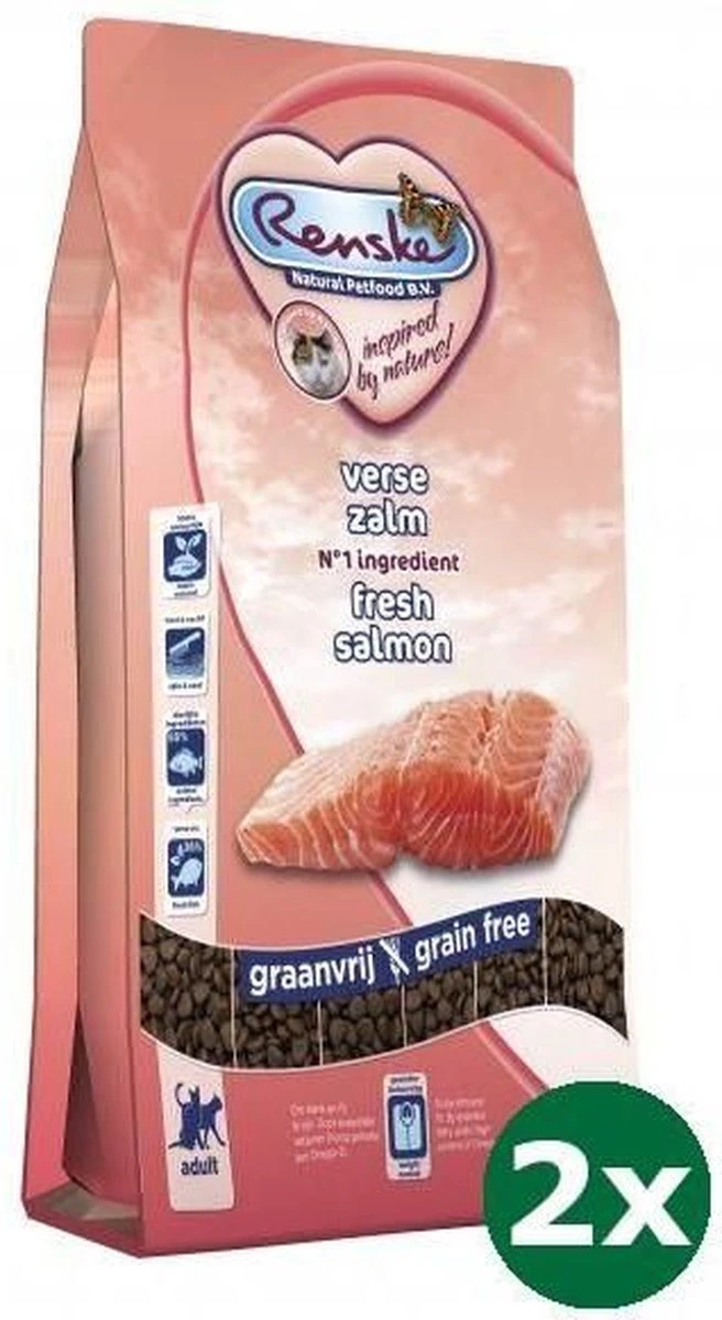 Renske Super Premium Adult Verse Zalm 400 grRenske Super Premium Adult Verse Zalm is volledige diervoeding voor de kat. Het is een een complete, lichtverteerbare graanvrije voeding met verse zalm. Geschikt voor katten van alle rassen. * Verse zalm als hoofdingrediënt (36%, totaal dierlijke ingrediënten 65%). * Voor regelmatige, stevige ontlasting. * Ondersteunt de schildklier, door het lage gehalte iodine.Samenstelling: Vers bereide zalm (36%), gedroogde zalm (23%), aardappel, zoete bataat, zalmolie (4%), zalmbouillon (2%), plantaardige vezels, biergist, lijnzaad, mineralen, cranberries, zeewier, beta-glucanen, mariadistel, yucca, glucosamine (175 mg/kg), methylsulfonylmethaan (MSM) (175 mg/kg), chrondroïtinesulfaat (125 mg/kg).Toevoeginsmiddelen (per kg): Nutritionele toevoegingsmiddelen: Vitamine A (retiny