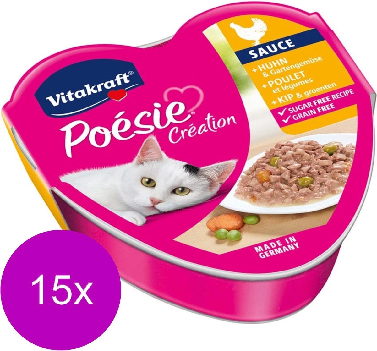Hoofdvoeding met kip en groente in saus. Elke schaal Poésie bevat een onweerstaanbare smaak en heerlijke verse ingrediënten. Deze volledige natvoeding is geheel op de voedingsbehoeften van volwassen katten afgestemd en is van de hoogste kwaliteit. Poésie wordt volgens een suikervrije receptuur bereid en bevat geen kunstmatige kleurstoffen en conserveringsmiddelen.